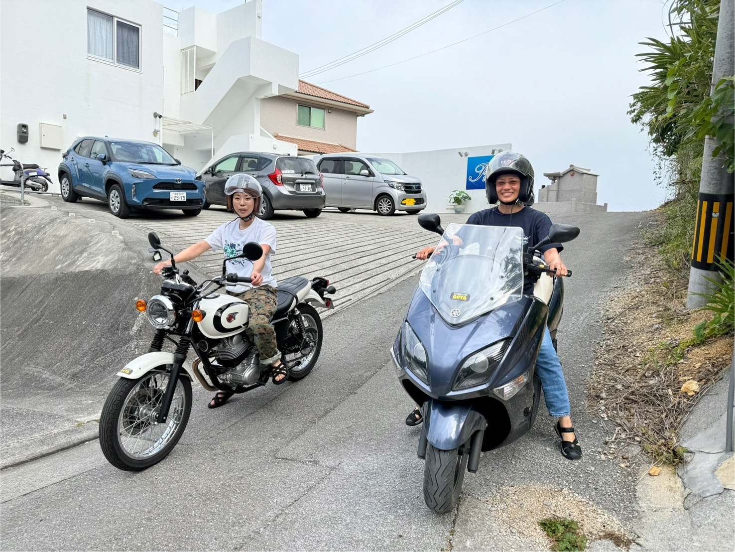 バイク2台でさっそうと現れたお二人さん。とってもカッコいい彼女達です!夜はおすすめのお店にも行けて良かったですね。ジンベイダイブ楽しんで〜👋